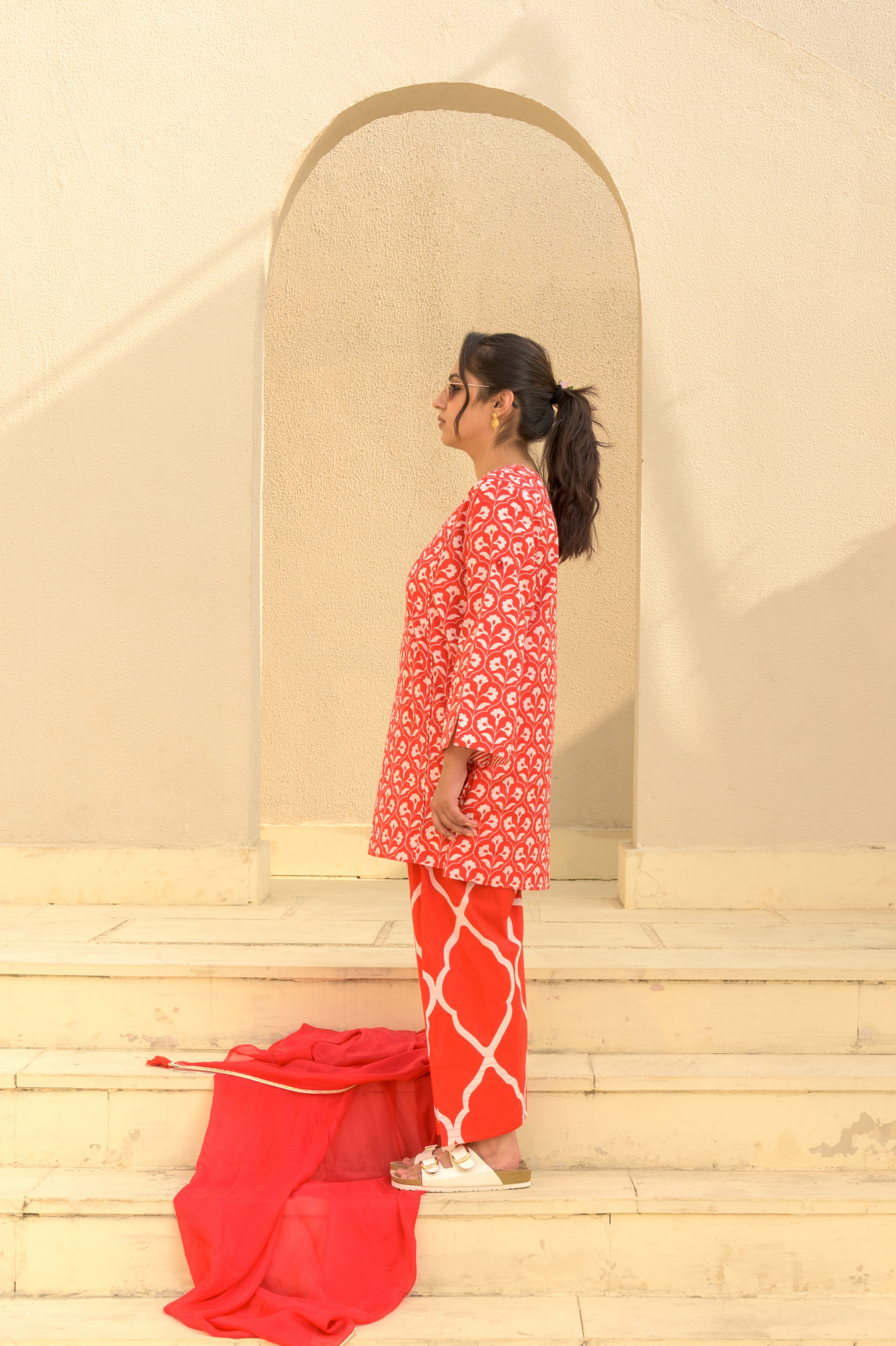 Handprinted in Jaipur, this pure cotton suit set blends timeless craft with a bold, modern edge. Featuring vibrant red- white design and a breezy farshi salwar, it’s designed for women who love comfort, colour, and culture—with a hint of sass. Made from 100% breathable cotton, this set delivers effortless style for everyday wear, travel, or relaxed festive dressing. Tradition re-crafted, mood elevated. Shop the perfect mix of heritage and contemporary cool.