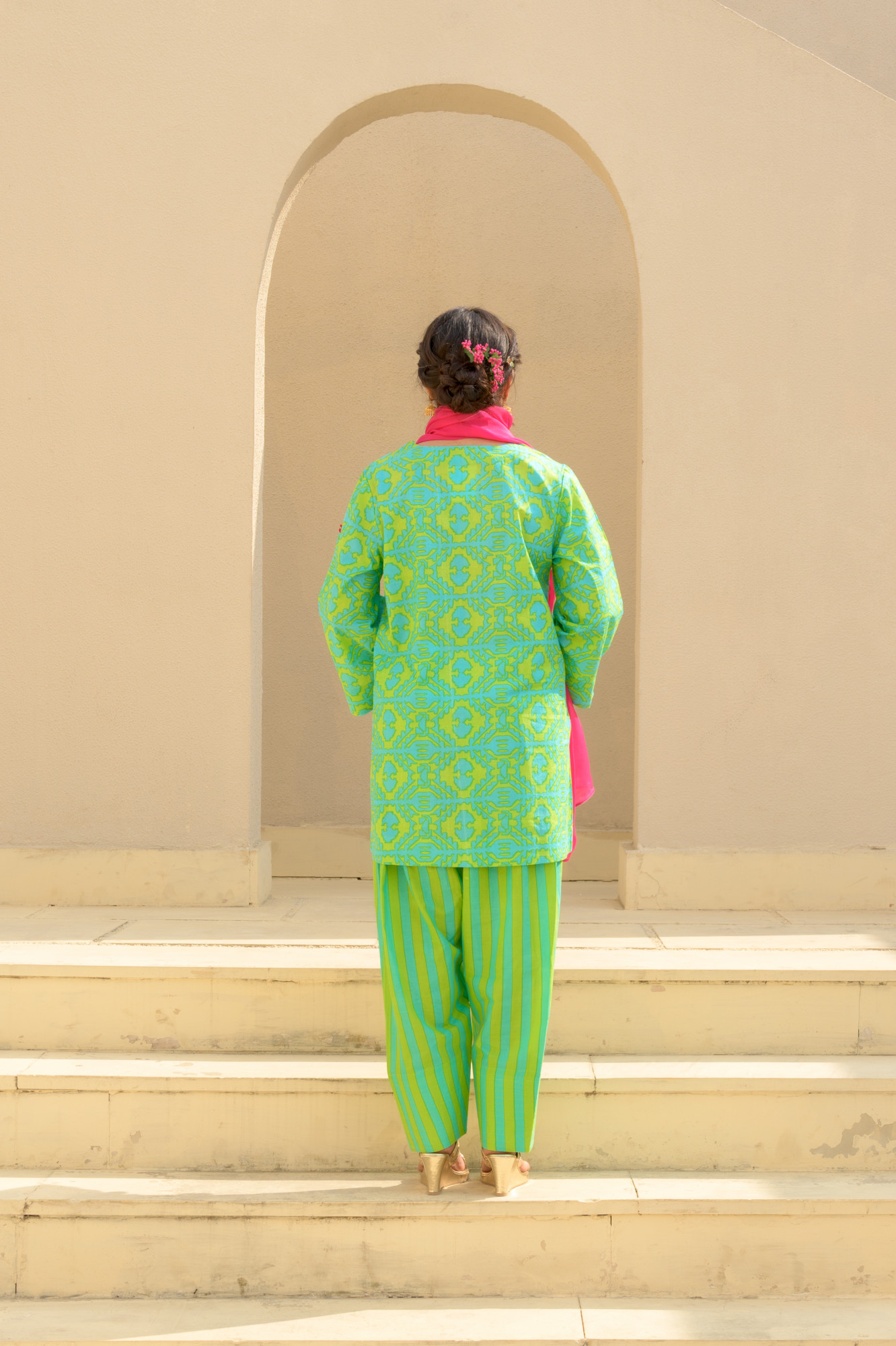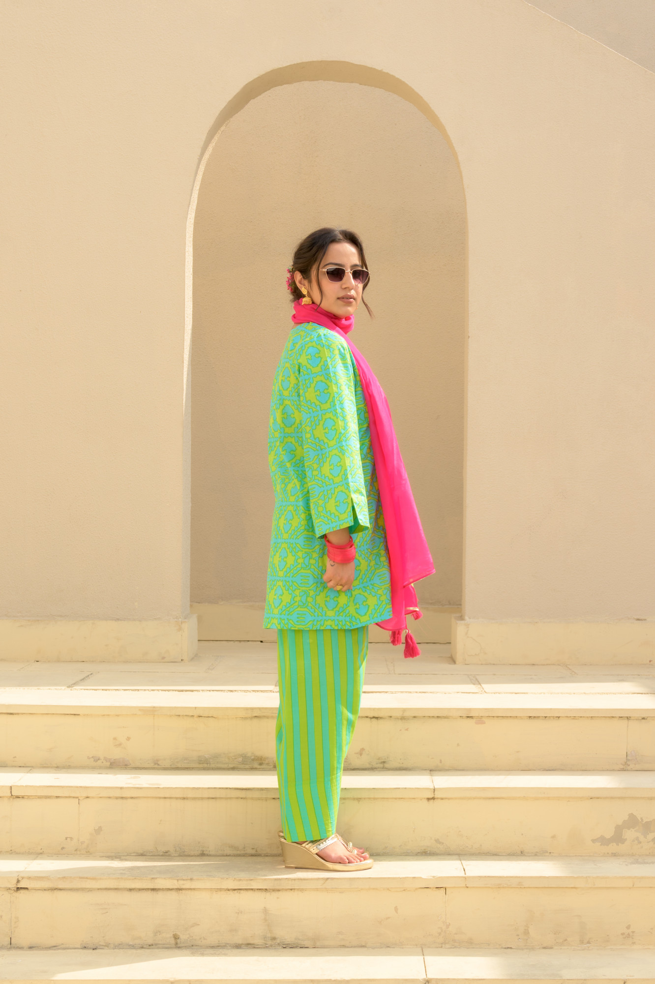 Handprinted in Jaipur, this pure cotton suit set blends timeless craft with a bold, modern edge. Featuring vibrant aqua-lime ikat design and a breezy farshi salwar, it’s designed for women who love comfort, colour, and culture—with a hint of sass. Made from 100% breathable cotton, this set delivers effortless style for everyday wear, travel, or relaxed festive dressing. Tradition re-crafted, mood elevated. Shop the perfect mix of heritage and contemporary cool.