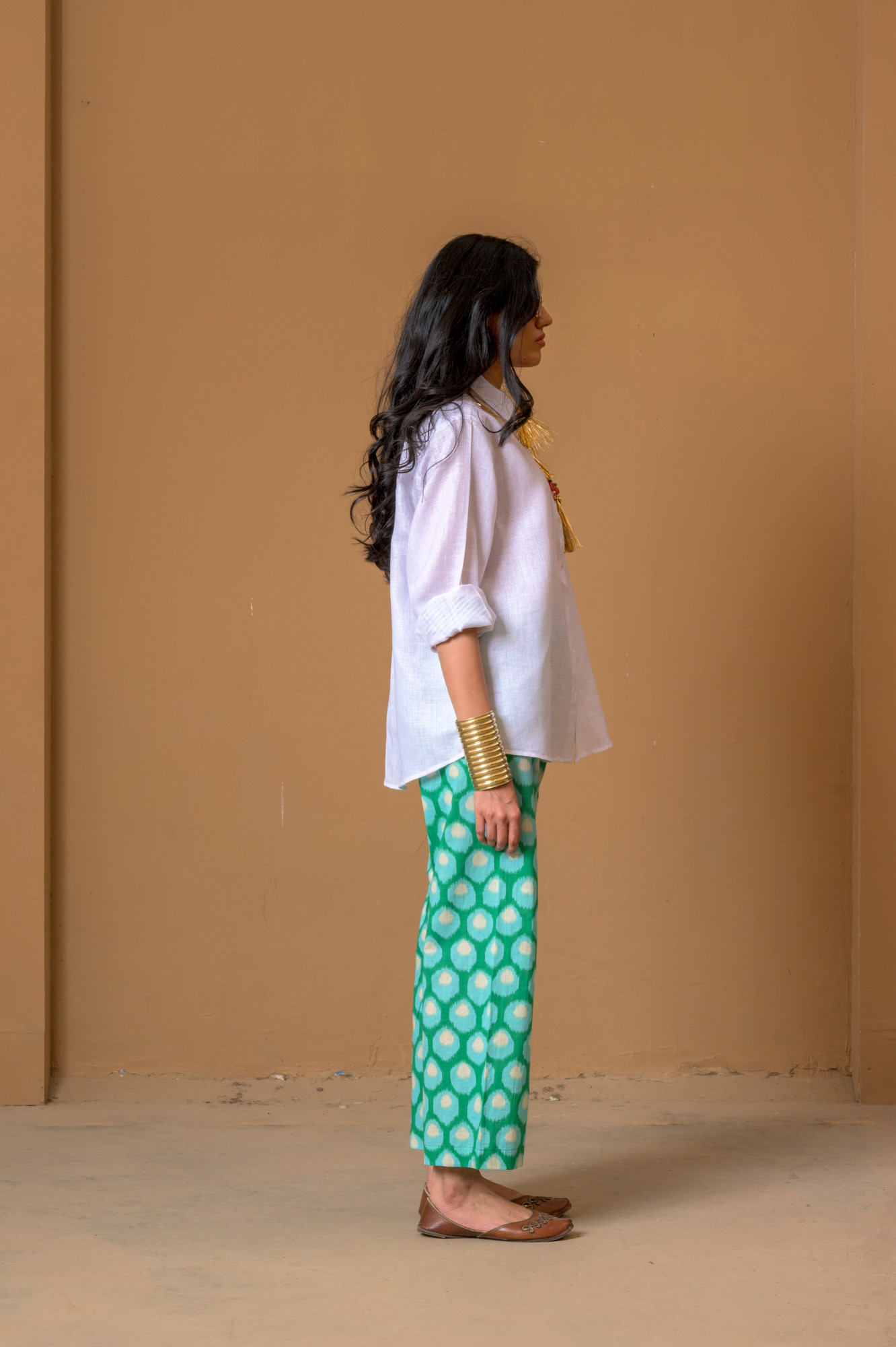 A wardrobe essential, the Bela White Shirt elevates every look with effortless sophistication. Crafted from lightweight, breathable linen-cotton, its relaxed fit drapes perfectly—whether tucked, tied, or left loose. It’s the ultimate canvas for bold styling; pair it with striking printed trousers, layered jewelry, or even over a swimsuit. Roll the sleeves and seize the day in timeless comfort and polish.