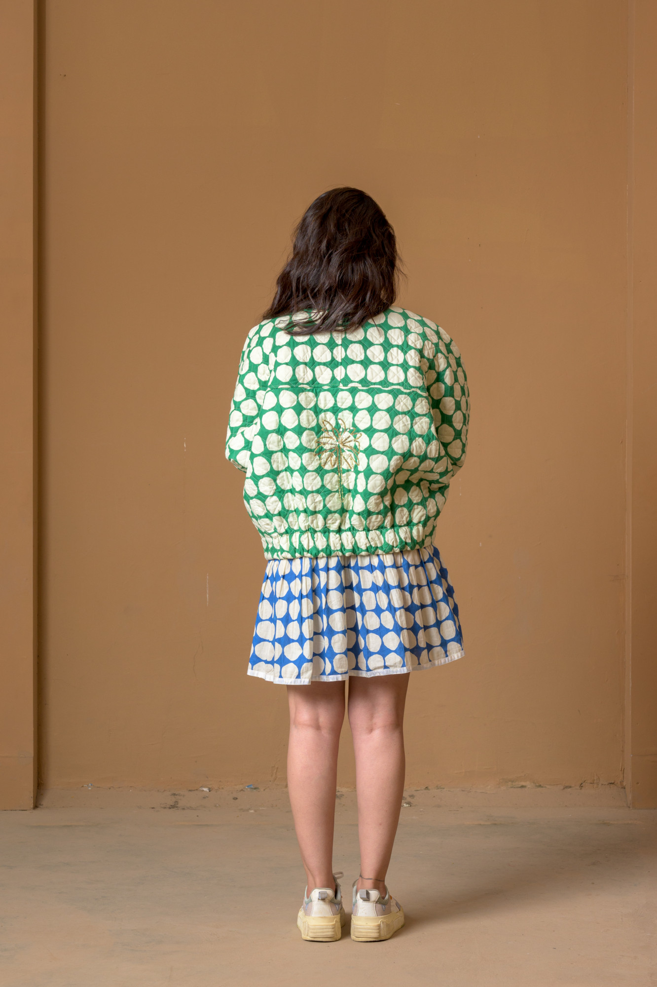 Your new statement-maker in the wild. This handcrafted green bomber jacket brings oversized puff, juicy polka dots, and a whole lot of attitude. Lightweight yet bold, it’s the kind of piece that instantly turns a simple outfit into a full personality. With a relaxed fit, snap buttons, and that deliciously quirky print, this jacket doesn’t ask for attention—it takes it. Perfect for days you want to stay cozy but still serve unapologetic, artsy energy.