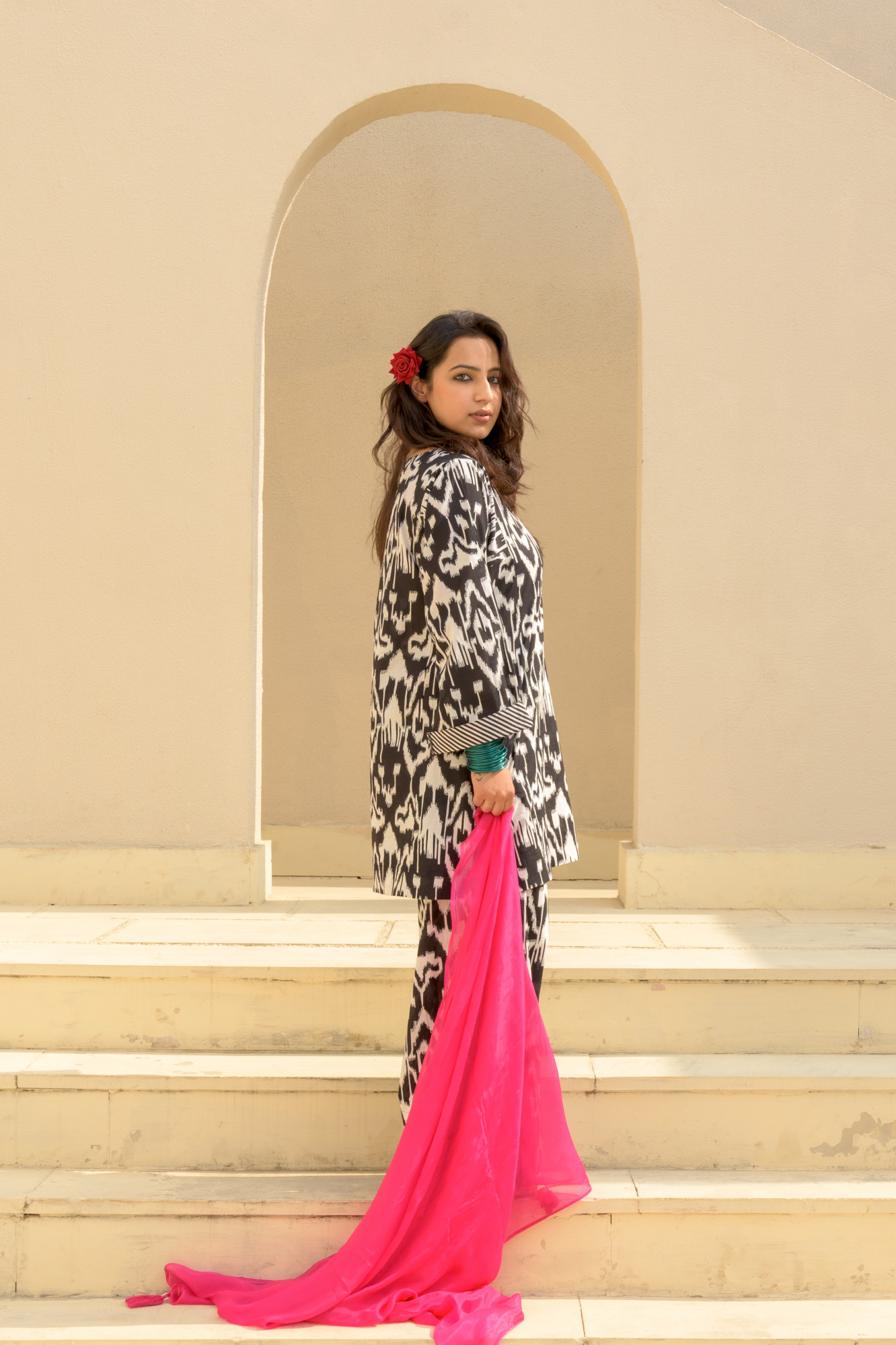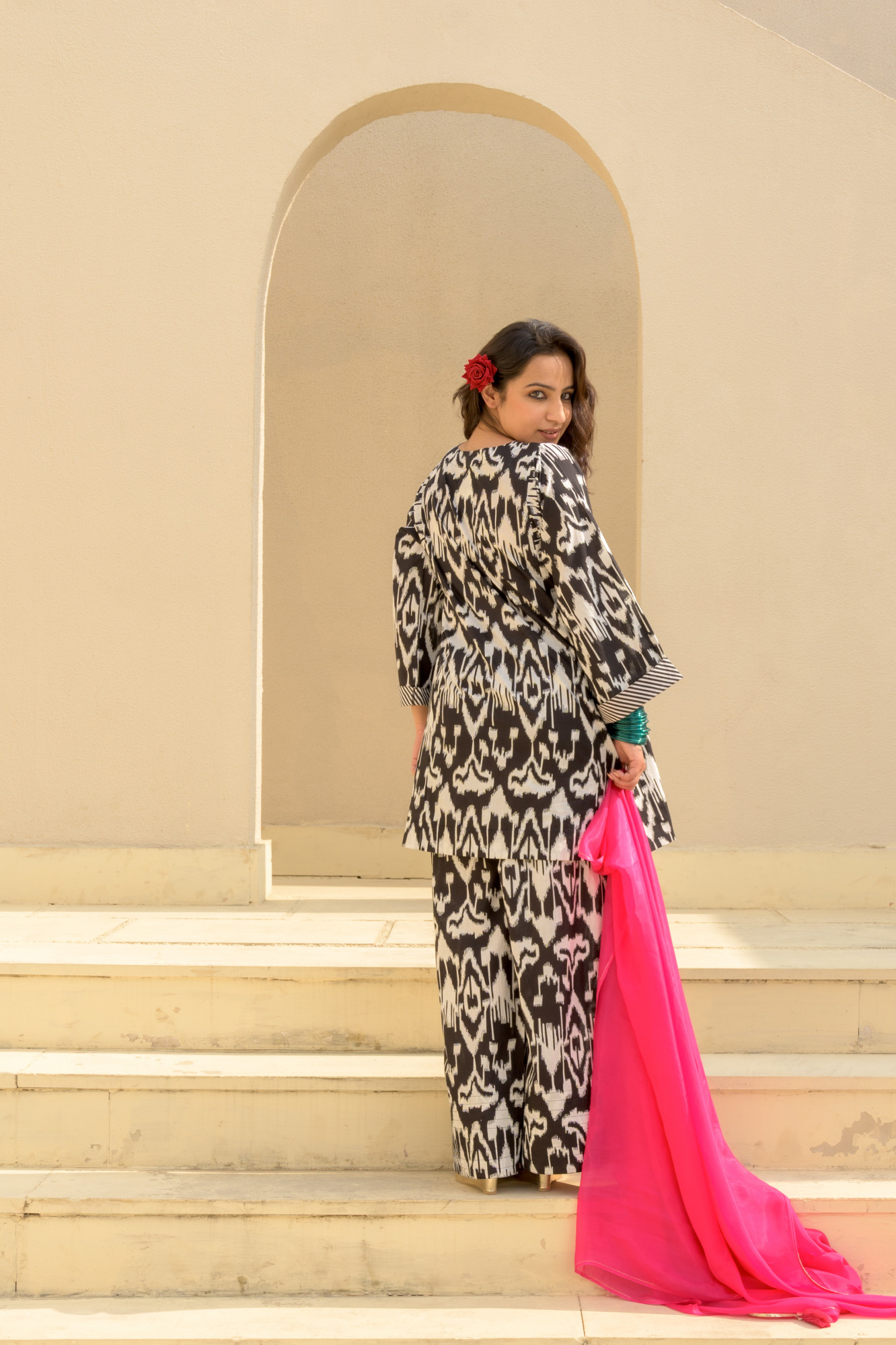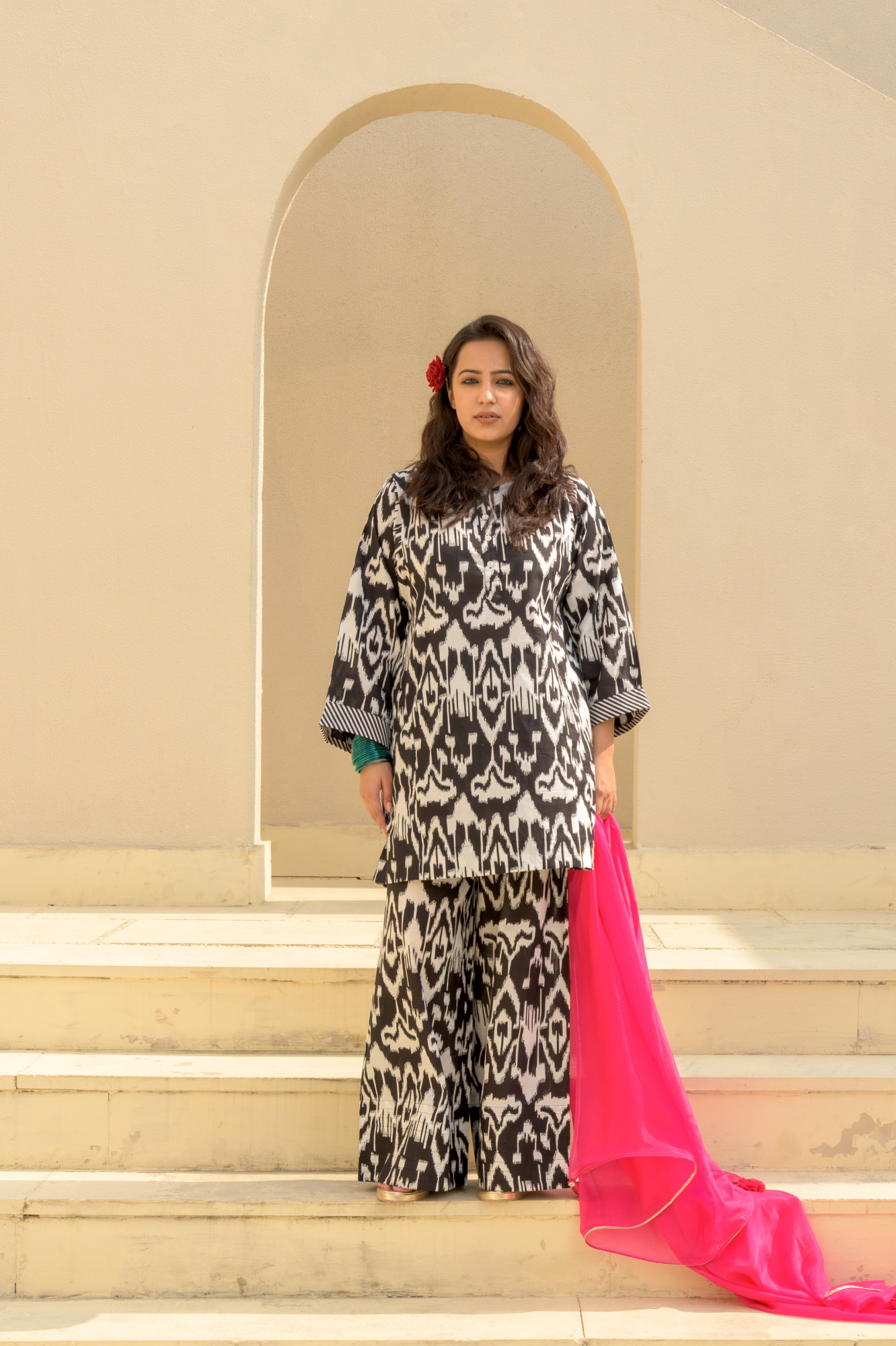 Bold, effortless, and born to steal the spotlight. This black-and-white ikat cotton set brings maximum drama with minimal effort—perfect for days when you want comfort but refuse to fade into the background. The relaxed kurta and wide-leg pants keep it breezy, chic, and totally boss-girl approved. Want to dial up the flair? Pair it with the hot-pink dupatta (sold separately) for an instant pop of glam. Wear it your way—loud, proud, and unapologetically stylish.