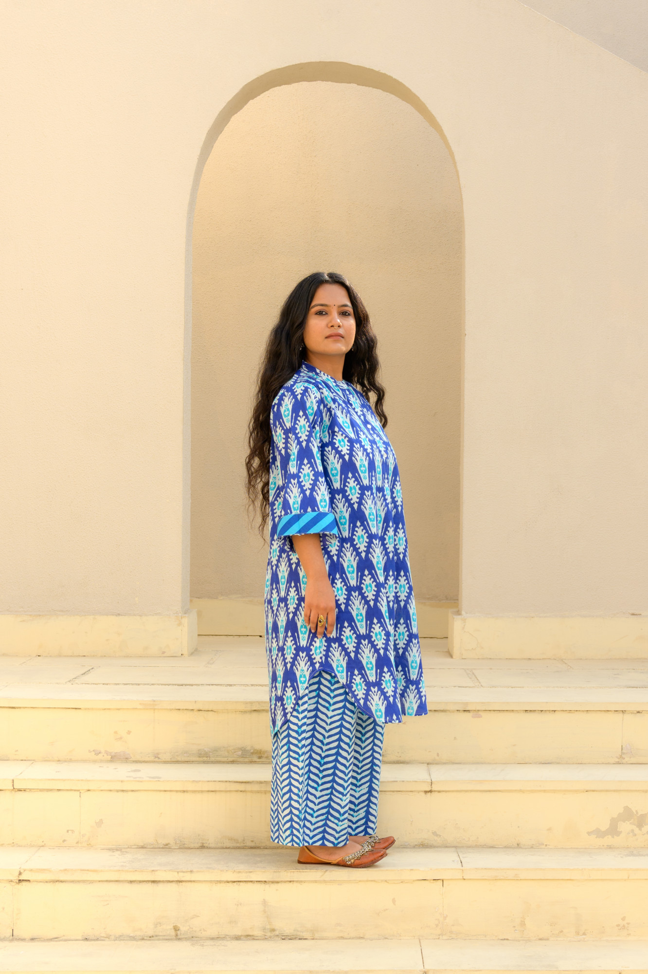 Meet the set that does all the talking—so you don’t have to. This pure cotton kurta, handprinted in Jaipur, serves quintessential print pairingswith zero effort. Paired with wide-leg printed pants that move like a breeze, it’s the perfect blend of comfort and “I woke up fabulous.” Soft, breathable, and unapologetically eye-catching, this duo is made for women who don’t believe in blending in. Wear it, own it, and let the compliments chase you.