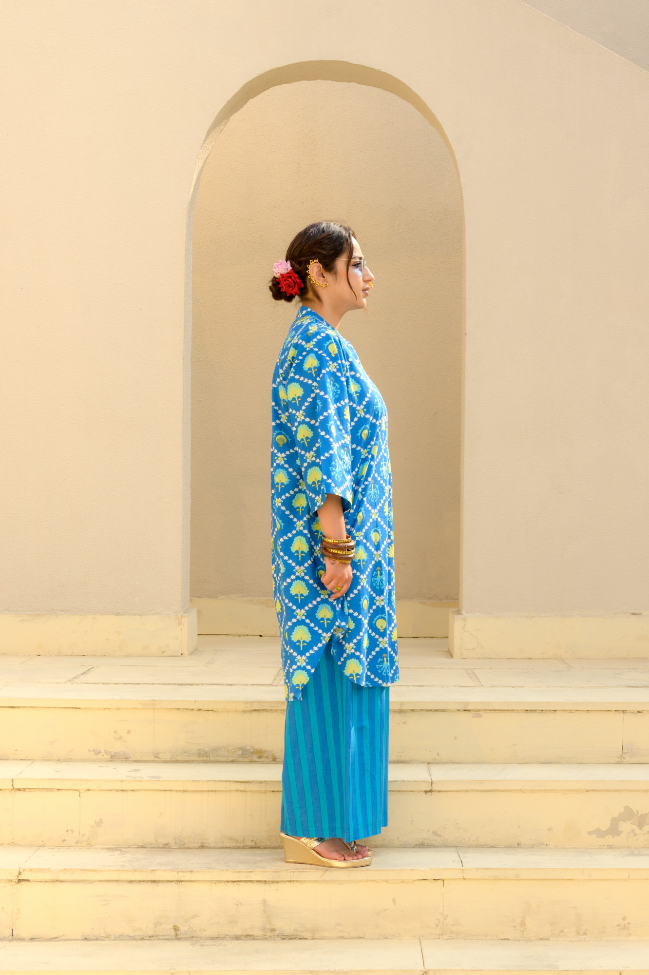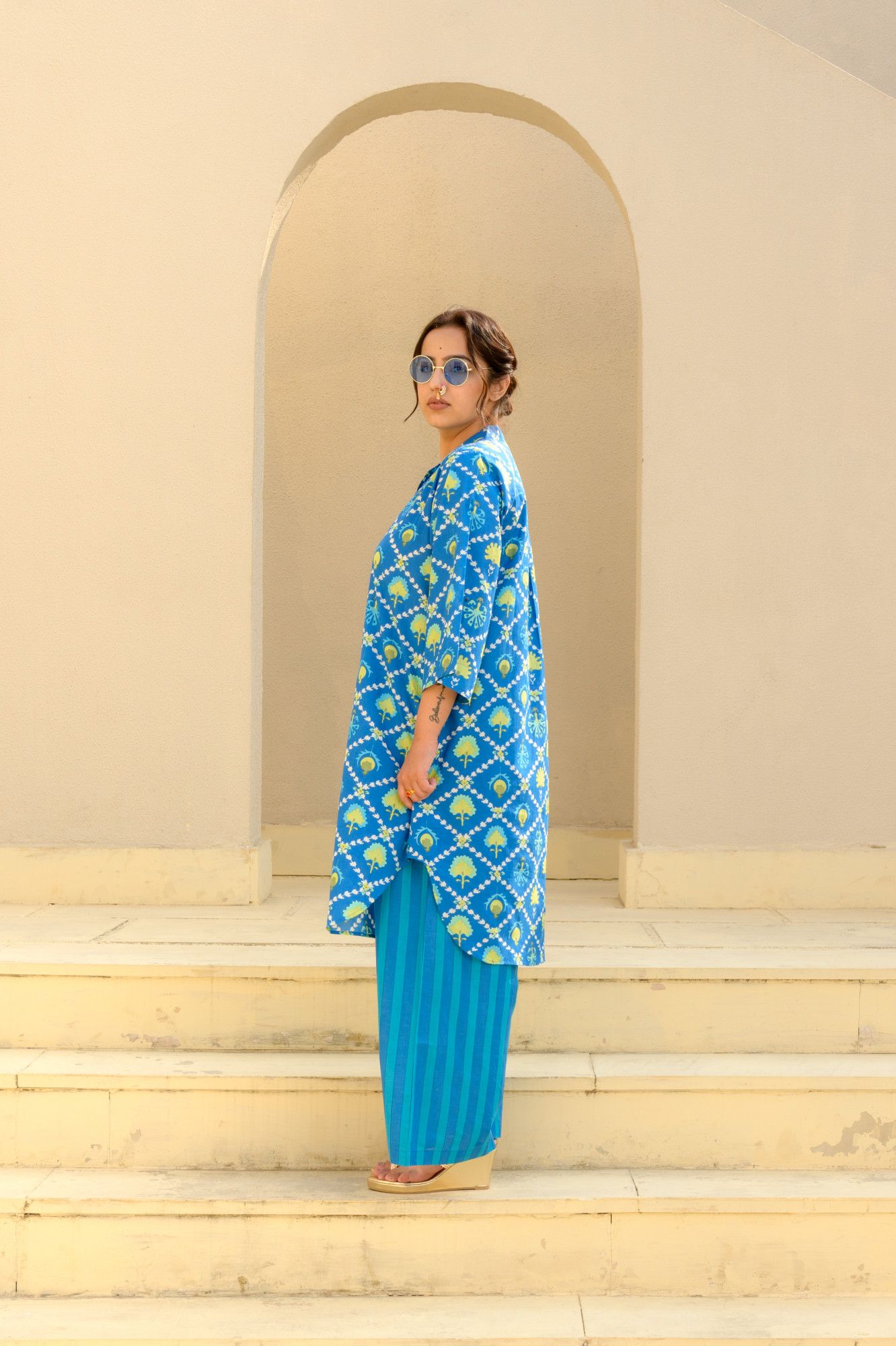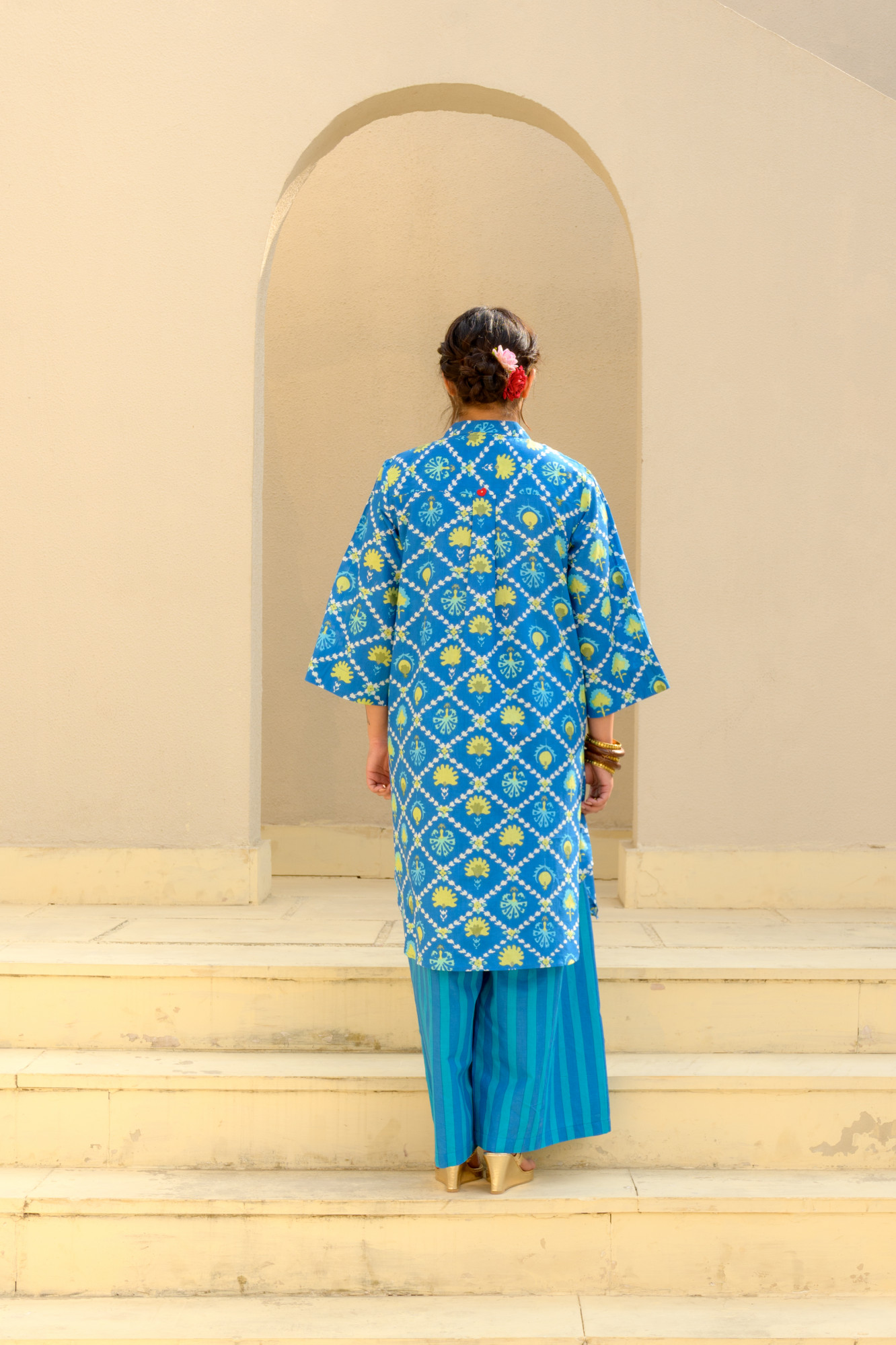 Meet the set that does all the talking—so you don’t have to. This pure cotton kurta, handprinted in Jaipur, serves quintessential suzani with zero effort. Paired with wide-leg printed pants that move like a breeze, it’s the perfect blend of comfort and “I woke up fabulous.” Soft, breathable, and unapologetically eye-catching, this duo is made for women who don’t believe in blending in. Wear it, own it, and let the compliments chase you.