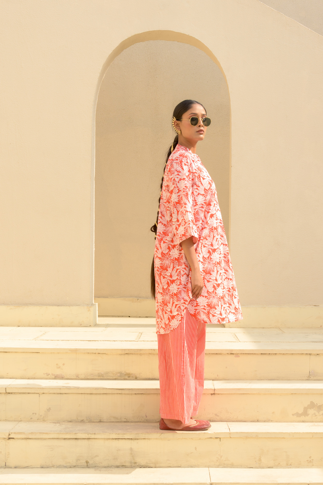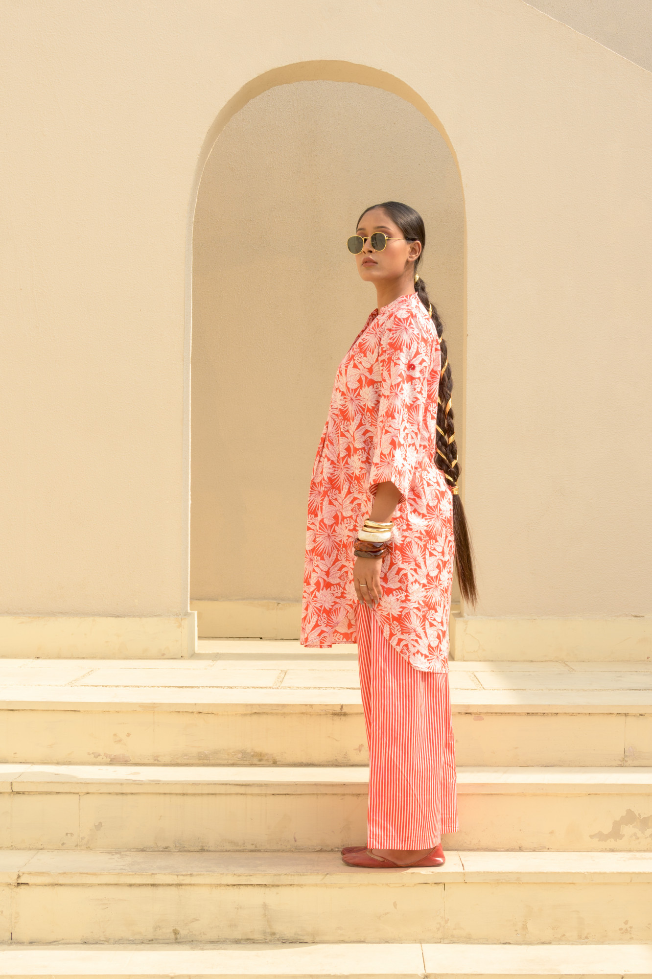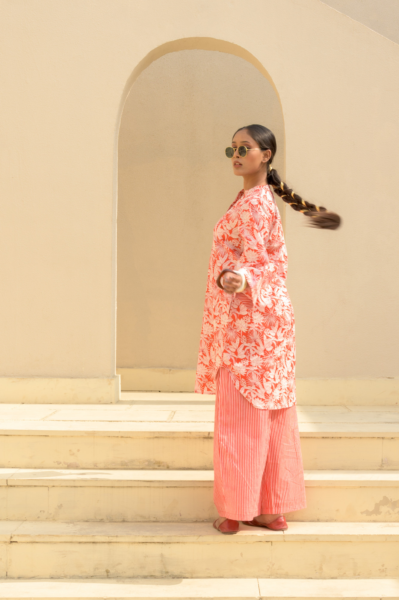 Meet the set that does all the talking—so you don’t have to. This pure cotton kurta, handprinted in Jaipur, serves quintessential print pairingswith zero effort. Paired with wide-leg printed pants that move like a breeze, it’s the perfect blend of comfort and “I woke up fabulous.” Soft, breathable, and unapologetically eye-catching, this duo is made for women who don’t believe in blending in. Wear it, own it, and let the compliments chase you.