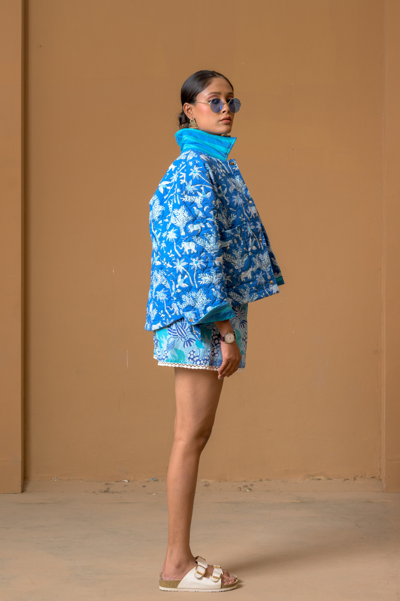Dive into summer with the vibrant Zingo Sanctuary Quilted Jacket. Crafted from soft, breathable cotton, this cropped piece features a striking blue and white tropical print. The relaxed, structured fit makes it the perfect stylish layering piece. Even better, it's reversible, offering a solid sky-blue interior for versatile wear. Wear it open over the matching bralette and shorts for a head-to-toe resort look, or pair it with simple white denim.